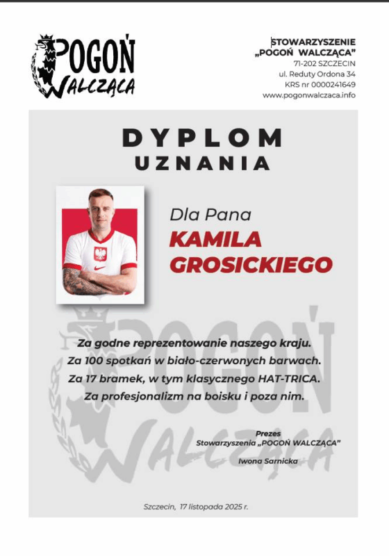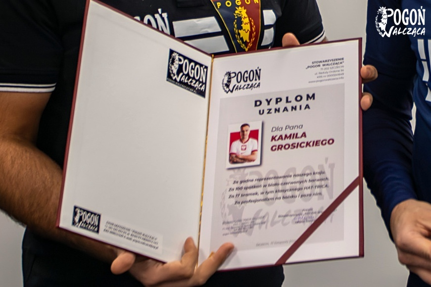Niedawno Kamil Grosicki zanotował setny występ w reprezentacji Polski. Dzisiaj z tej okazji kapitan Pogoni Szczecin został nagrodzony przez Stowarzyszenie ,,Pogoń Walcząca”.