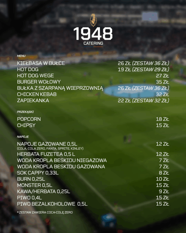 - Kiełbasa w bułce (kiełbasa od lokalnego producenta, czyli Spiżarni Dominika. Co istotne, ”bez E” czyli konserwantów, barwników, wzmacniaczy smaku i przeciwutleniaczy. Dostawcą pieczywa jest wieloletni partner klubu, marka Asprod),